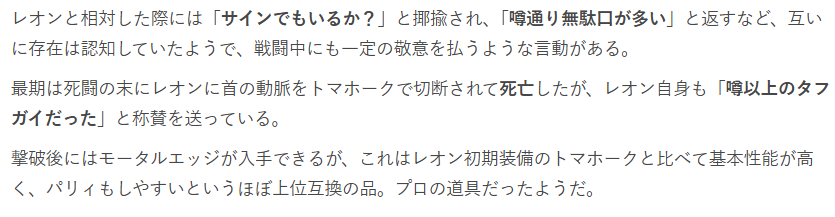 今作のガスマスク男は、レオンに首の動脈をトマホークで切断されて死亡します。