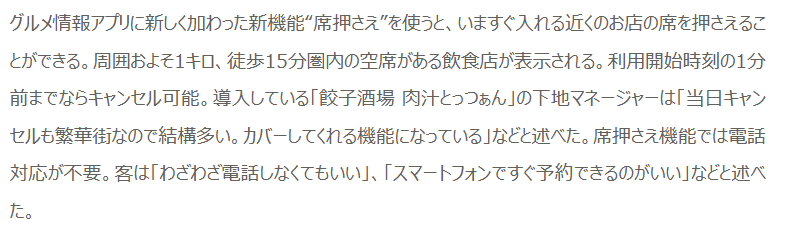 「周囲およそ1キロ、徒歩15分圏内の空席がある飲食店が表示される」と紹介されています。