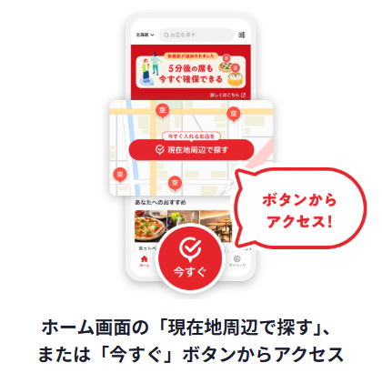 アプリを開き、「現在地周辺で探す」か「今すぐ」をタップすると、対象店舗が表示されます。