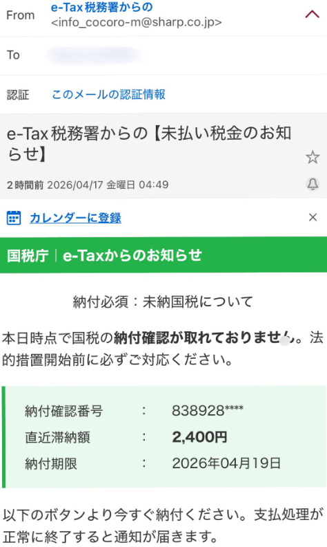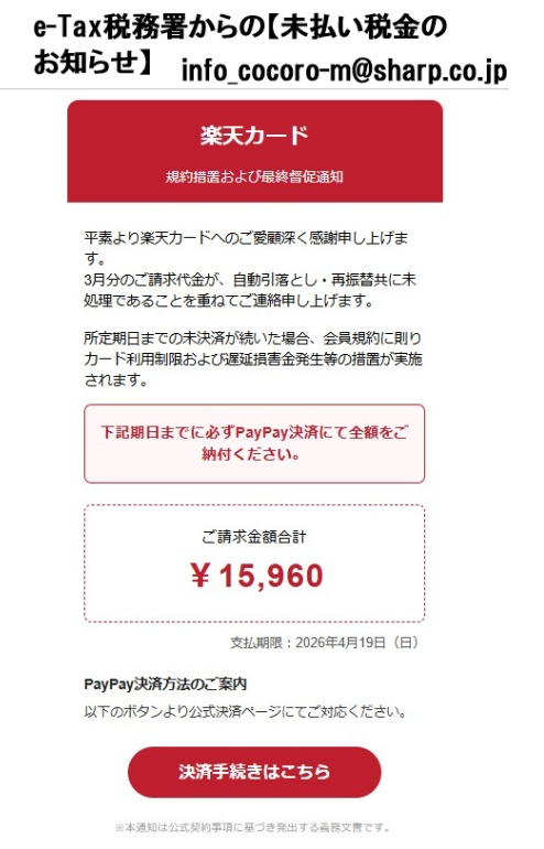 info_cocoro-m@sharp.co.jpのメルアドで、多数の金融機関や、「楽天」や「e-Tax税務署」からのメールが届いているといった事例が急増しています!