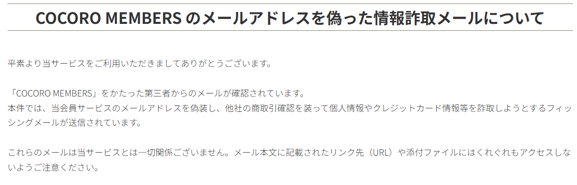 「当会員サービスのメールアドレスを偽装し」たメールは、「当サービスとは一切関係ございません」と記載されています。