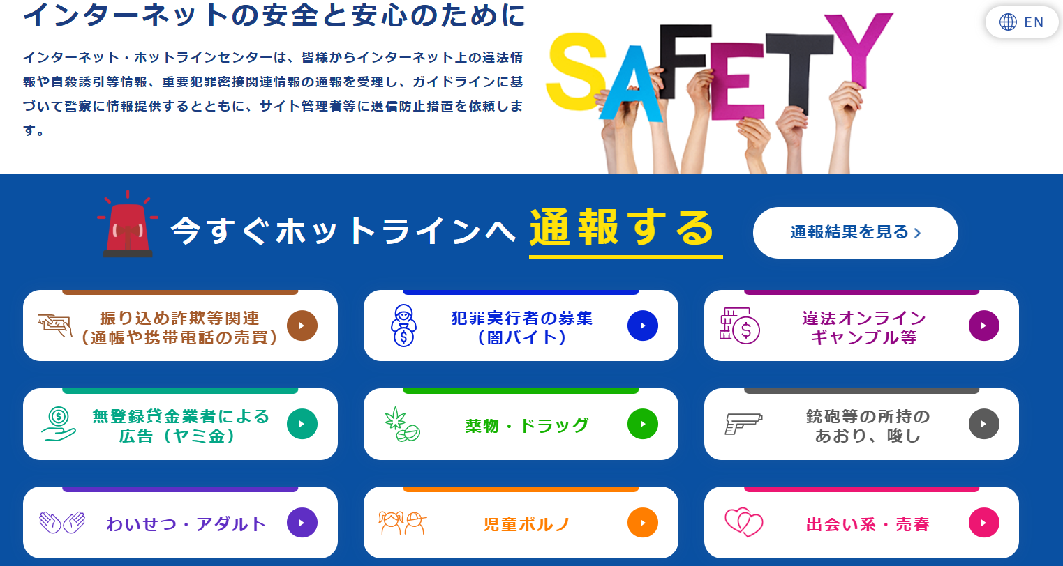 警察のサイトには、ネット被害専門のホットラインセンターがあります。