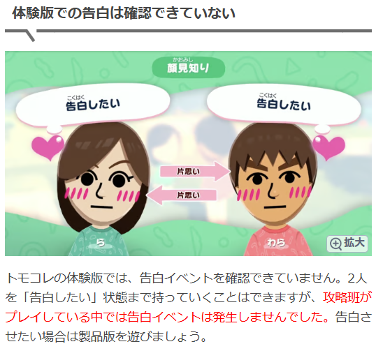 最初の章でも説明しましたが、体験版における「告白」は、Miiを「告白したい」状態するまでが限界となります。