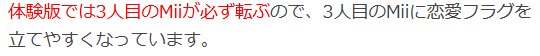 「片思い」になる方法は、3人目のMiiを作れば、必ず転んで恋愛フラグを立てることができます。