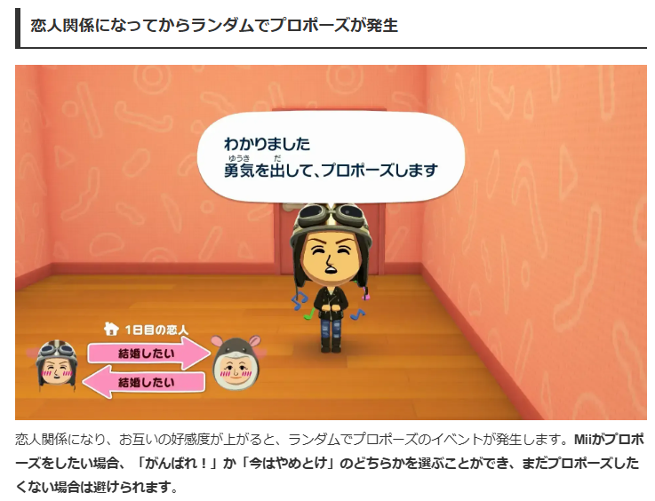 「恋人関係になり、お互いの好感度が上がると、ランダムでプロポーズのイベントが発生」と記載されています。
